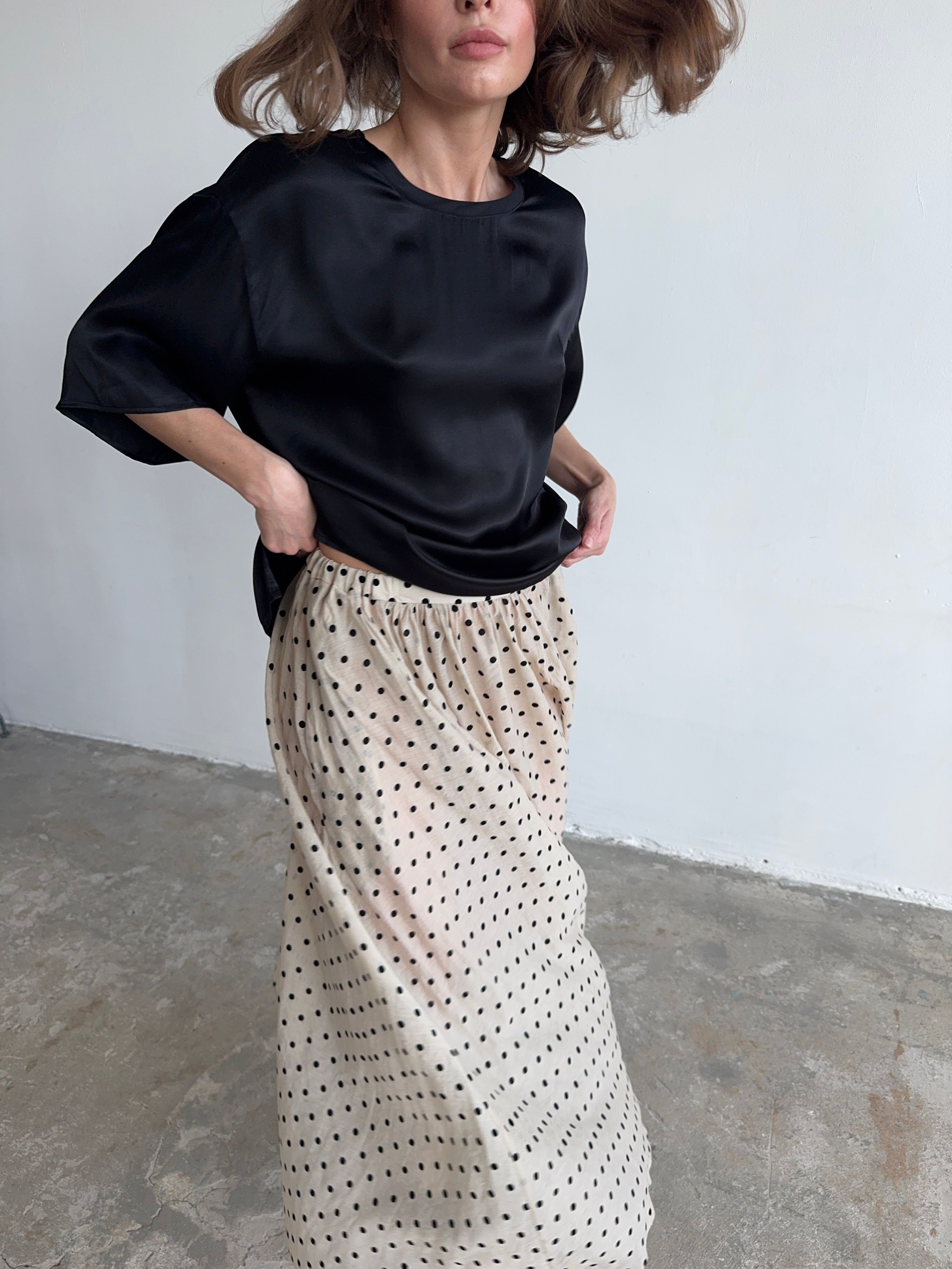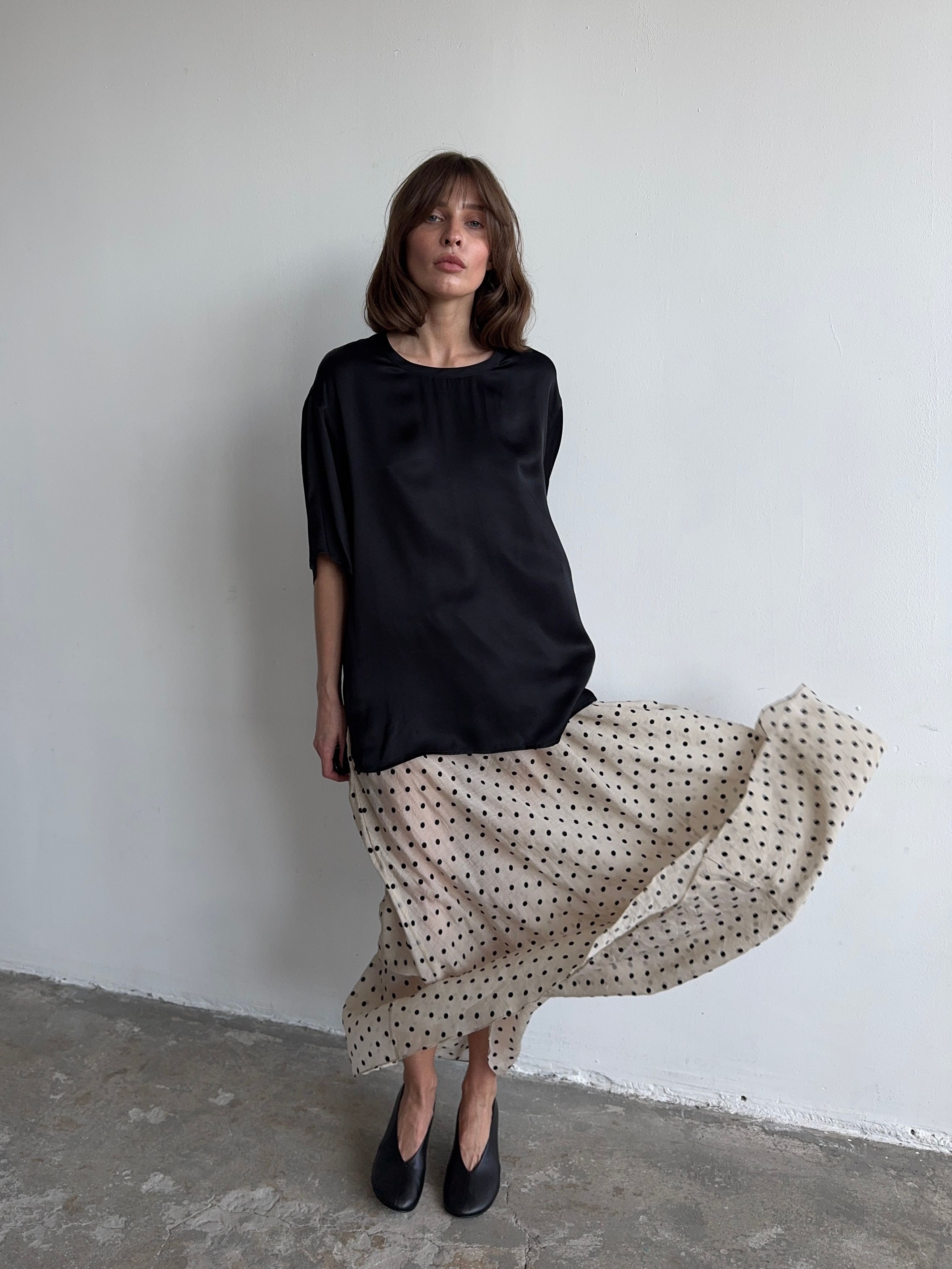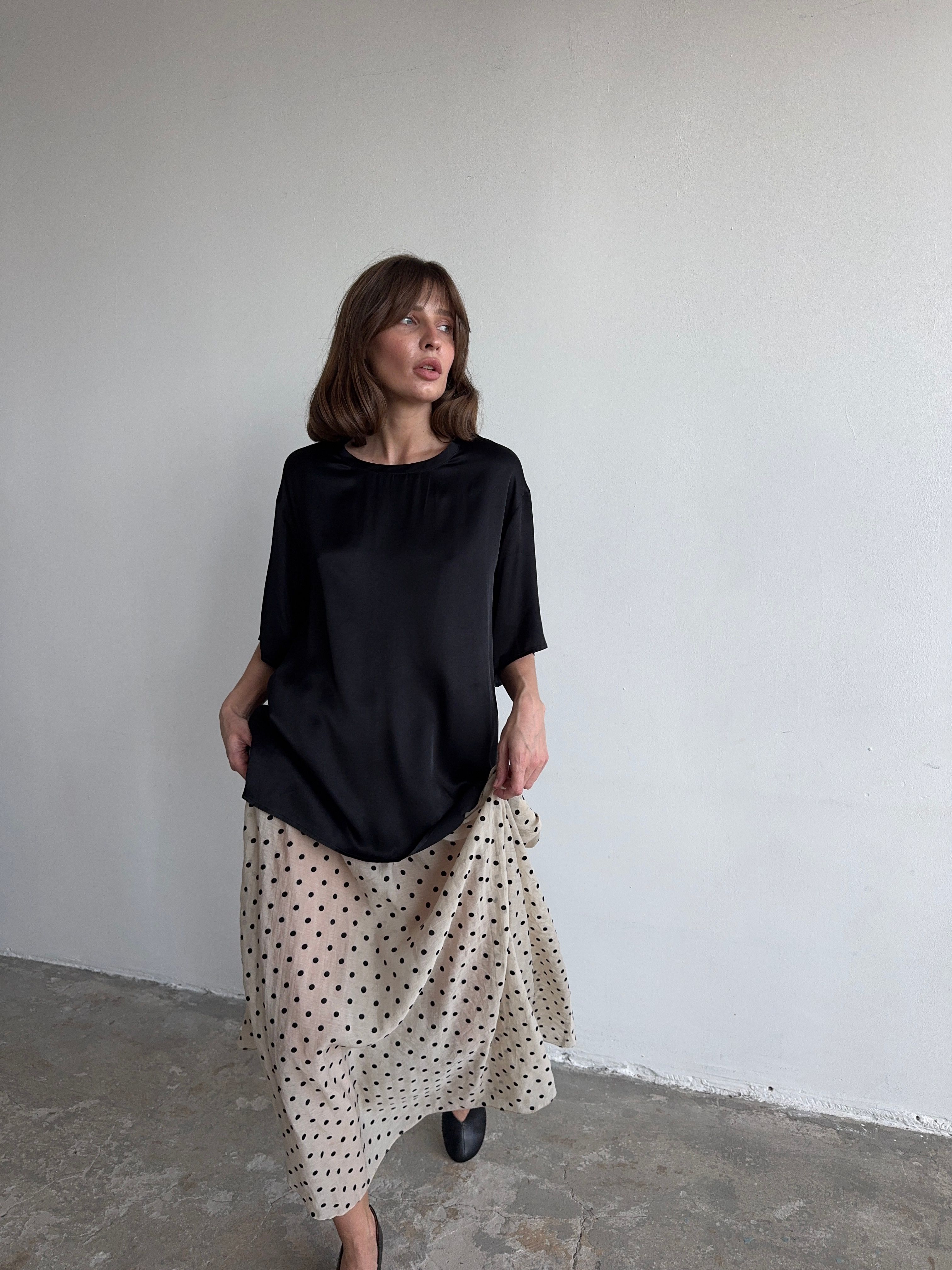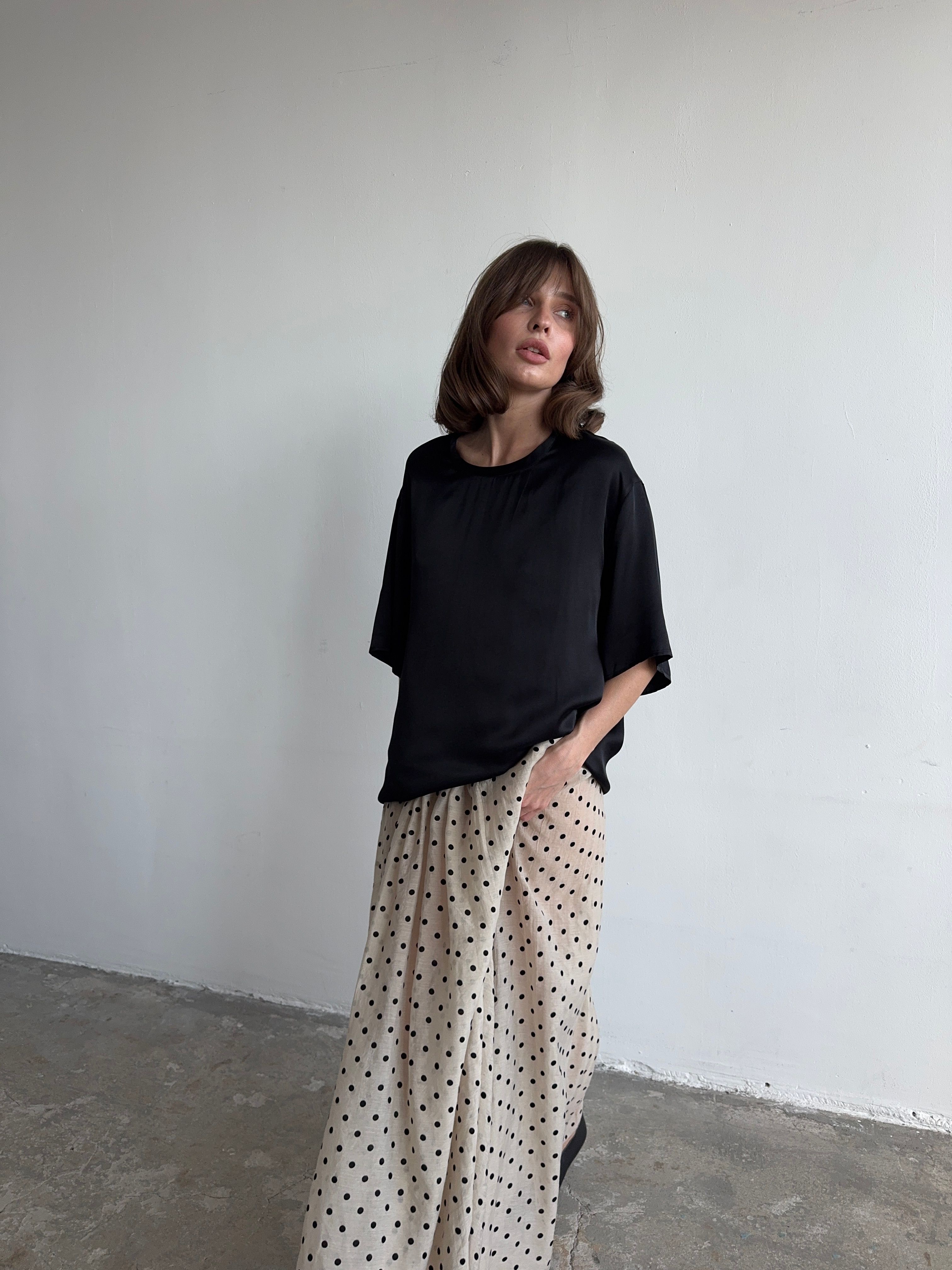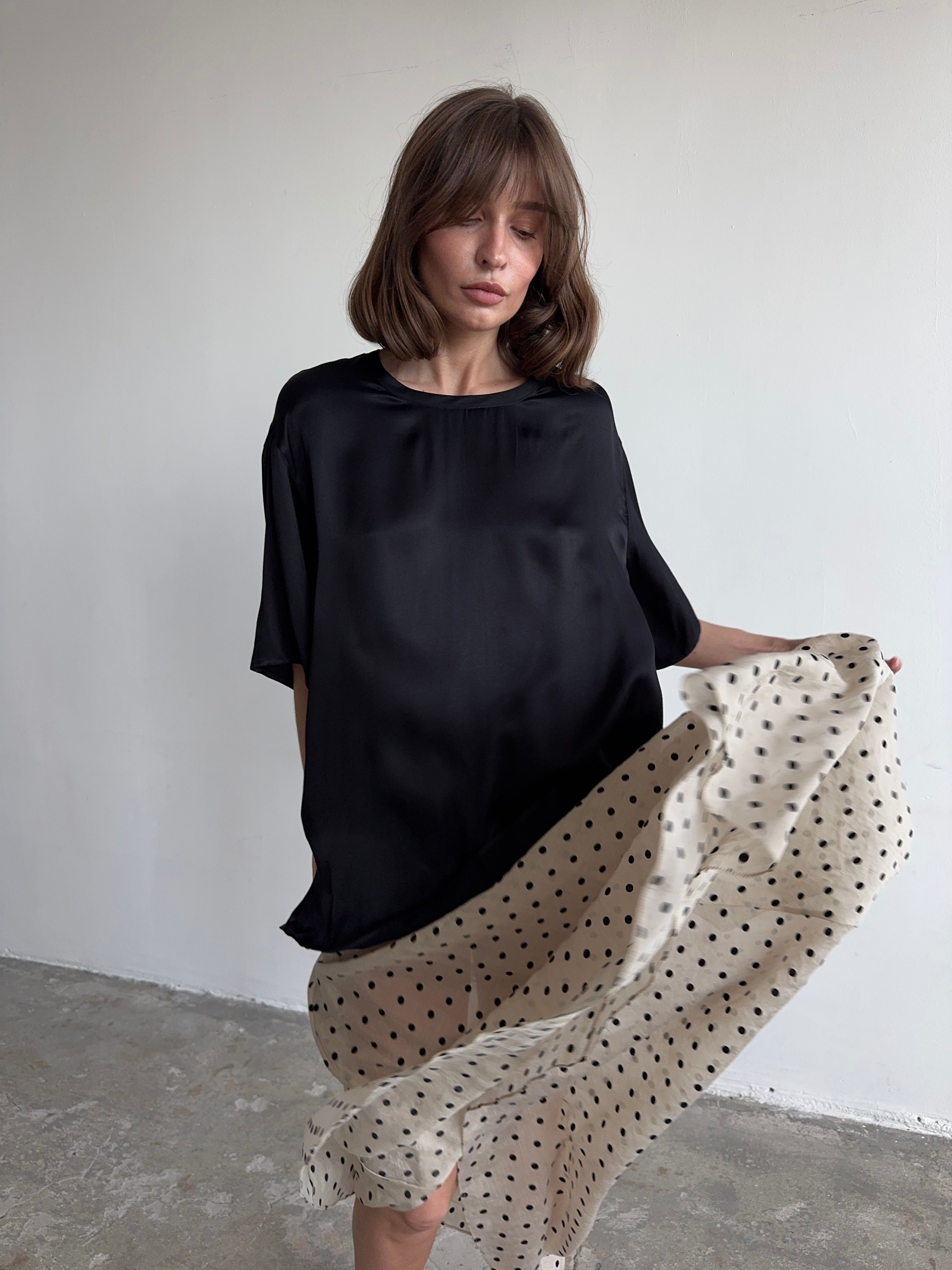 Тонко и легко. Базовая футболка, но совершенно новое прочтение за счет струящейся фактуры и нежного, но сочного, цвета.